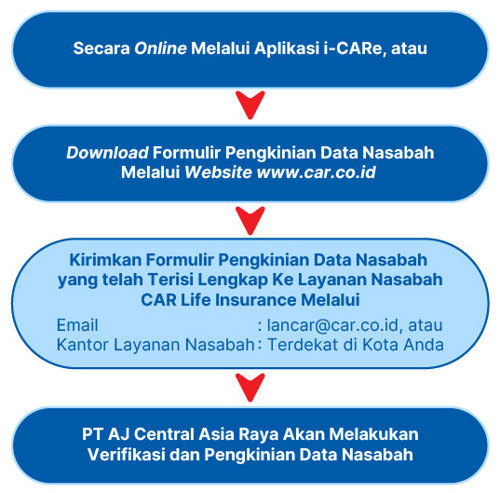Sesuai Peraturan BI No.14/2/PBI/2012 mengenai Penerapan Anti Pencucian Uang dan Pencegahan Pendanaan Terorisme dan untuk meningkatkan pelayanan, maka untuk memenuhi ketentuan tersebut, Pemegang Polis PT AJ Central Asia Raya diwajibkan untuk menyampaikan setiap perubahan data dengan mengisi formulir/surat pengkinian data disertai dengan dokumen pendukung seperti Copy e-KTP/ KITAS atau Paspor bagi WNA.